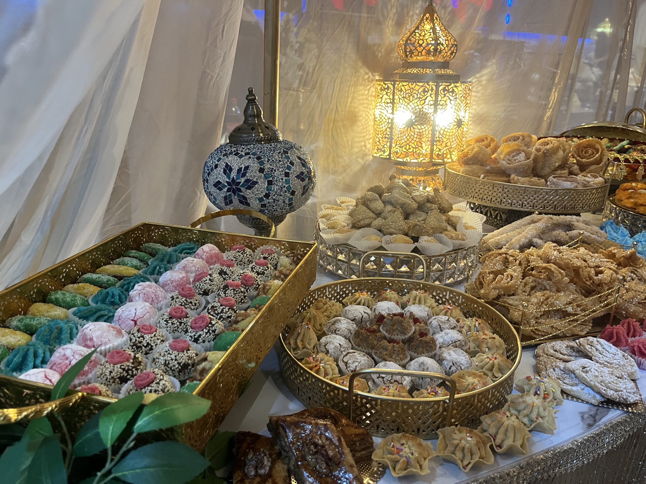 שולחן העוגיות שלנו מעוצב בכלי הגשה יוקרתיים, מגשי זהב מעוטרים, קערות קטיפה אדומות ואלמנטים דקורטיביים מסורתיים. כל עוגייה מונחת בקפידה, מסודרת בהרמוניה צבעונית שמעצימה את המראה הכללי ויוצרת מוקד מרכזי מרשים באירוע.